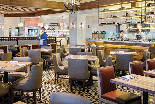 An interior remodel of the main restaurant at the Rancho Bernardo Inn. The restaurant features a outdoor dining area, a chef’s demonstration kitchen, a wine tasting room, an island bar, and lounge area.